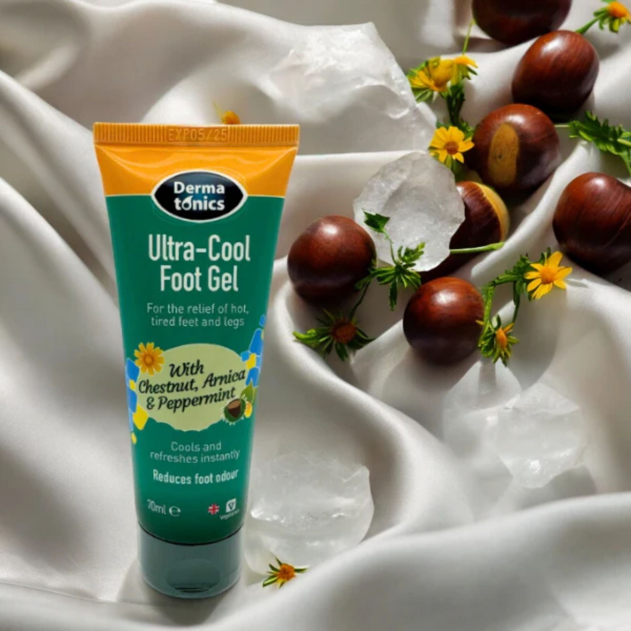 Dermatonics Ultra Cool Gel provides perfect relief for hot, tired feet and legs! This cooling gel combines chestnut, arnica, and peppermint to deliver a refreshing blast that cools and helps reduce odor at the same time.